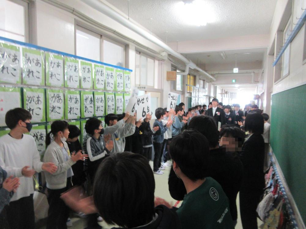 1~4年生までは、お別れ式をしました。各階を6年生が歩きました。