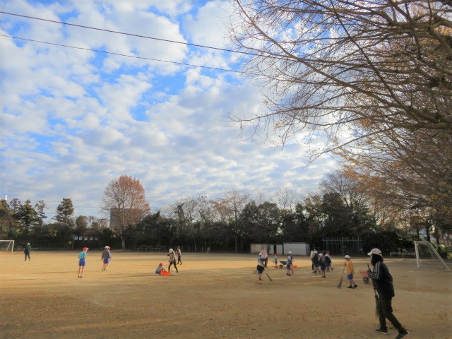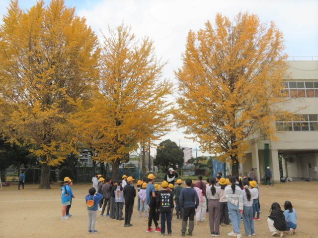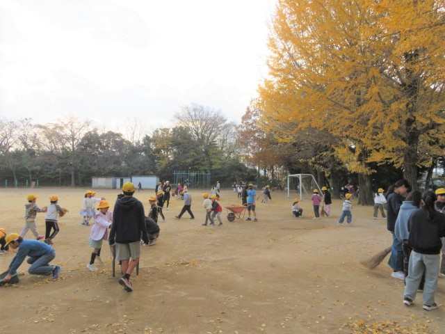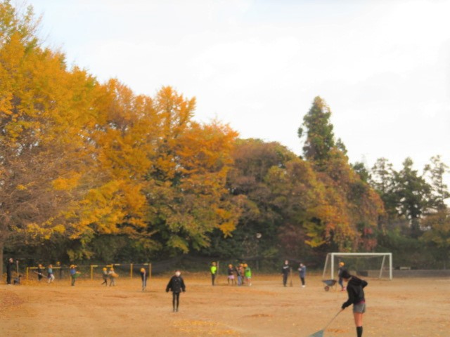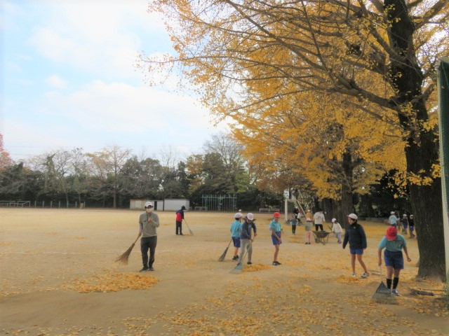 登校した子が次々と集まってきました。校庭奥の大イチョウの下にも落ち葉を集める実籾っ子の姿がありました。みんなで落ち葉集めをしていると、身体がぽかぽか温まってきます。