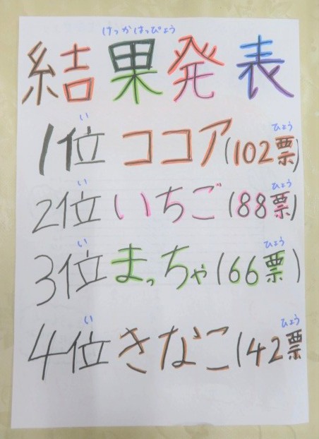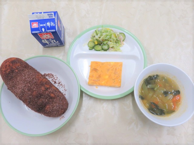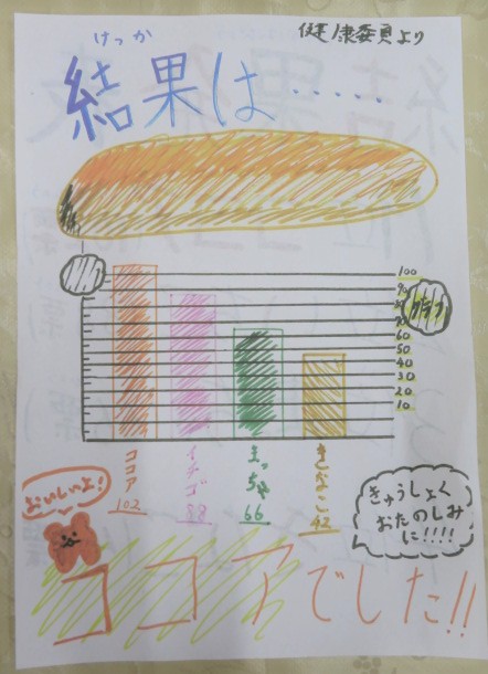 「オレは抹茶に入れたよ!」「揚げパンっていったらきなこだよ!」前日から会話が飛び交っていました。委員会の子供たちの作った資料からも、その楽しさが伝わってきます。
