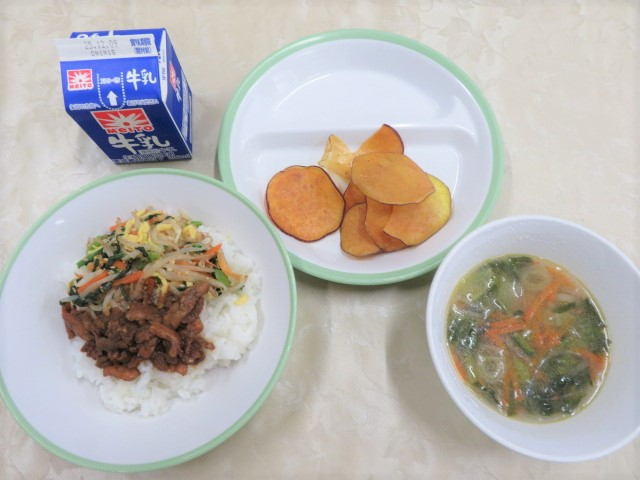 今日の給食は「世界の味めぐり献立:韓国バージョン」でした。どれもおいしいこと!コグマチップス?と思っていたら、コグマはサツマイモのことだそうです。いつもいつも、ありがとうございます!