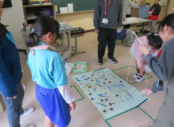5組は「モルックをなげたあとなんていえばいい?」の授業を展開しました。得点できた友達に「いいね!」「おしいね」と声を掛ける子供たち。相手チームにも温かい声を掛ける姿がありました。