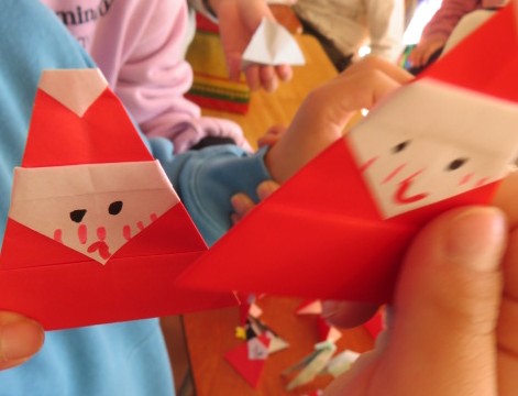「かわいい~!」「これがいい!」4組の子供たちも笑顔で選んでいました。かわいいサンタクロースとトナカイの折り紙は、一つ一つ表情が違って、どの作品もすてきです。