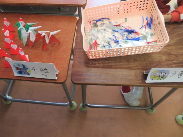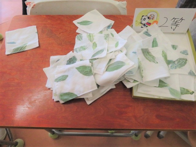 一人一人がひくくじには、4等・3等・2等・1等のどれかが書いてあります。それぞれに、たくさんの景品が用意されていました。折り紙の飾りが4等、葉っぱをラミネートしたしおりが3等です。