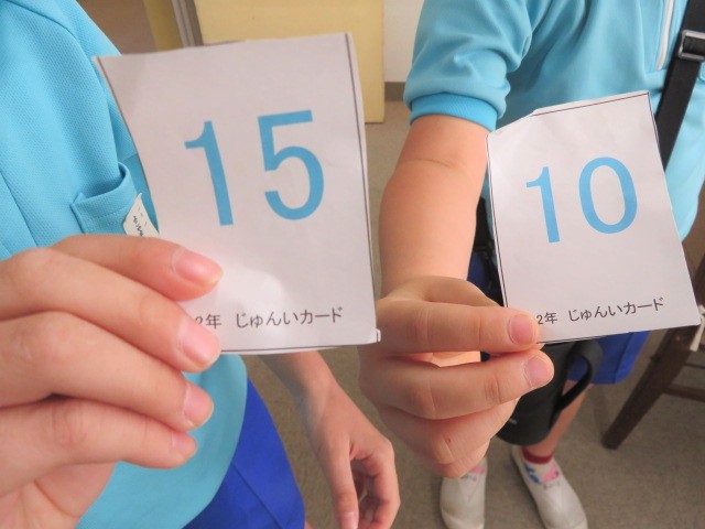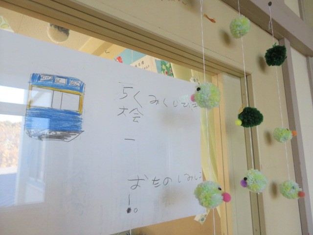 今日は5組で「5組くじびき大会」が開かれました。事前に配られた招待状をもって、今日は4組の子供たちが訪れました。招待状には「けいひんいっぱいあるよ」と書かれていて期待が高まります。