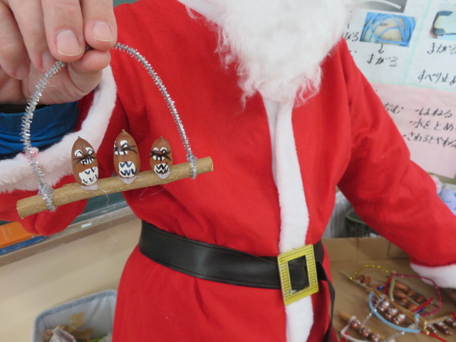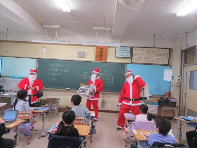 今日は公民館の方が、1、2年生と4組、5組を回ってくださいました。2人のサンタクロースに似ている人が実籾小にもいる気がするのですが…??