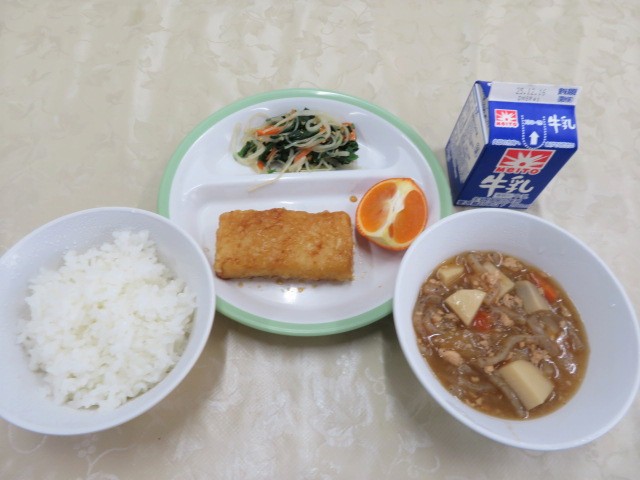 今日の給食「イカのかりんと揚げ」がふっくらやわらかくて甘じょっぱくて、ご飯がすすむことといったら!「そぼろ煮」の里芋は、免疫力をアップさせる力があるそうです。「みはや」もとてもおいしい柑橘類でした。