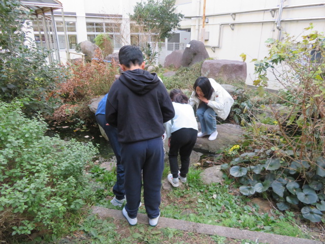 今週、栽培環境委員会が「ふれあいタイム」を催しています。業間はペンギン池、昼休みはホタルとモミの世話を体験させてくれます。今日も、カワニナをつかまえるところから教えてもらっていました。