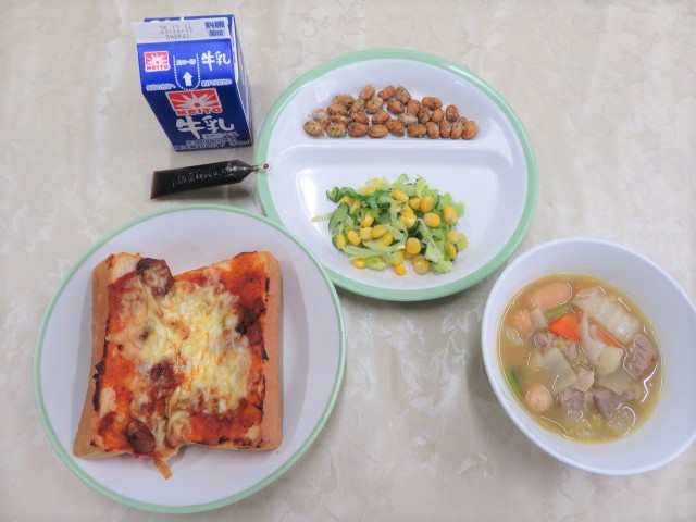 給食の時間、人気メニューのピザトーストとミルメークに「ちょーおいしい~!」と声があがっていました。一口飲んでから入れて、振って混ぜるのがコツです。昔は、瓶牛乳に粉のミルメークだったなと…。