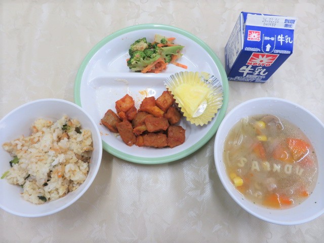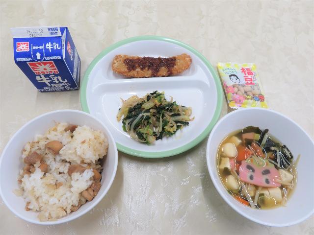 給食にも「節分メニュー」が登場しました。「とり飯・カリカリフライ・おかか和え」のおいしいこと!そして、なんといっても「おにたいじる」です!ネーミングもさることながら、それぞれの具が節分ならでは、です。