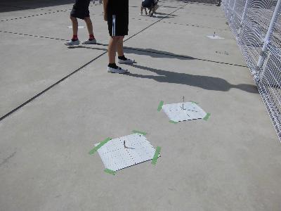 地面の様子と太陽 Tweet 更新日:2025年10月02日 3年生が理科で「地面の様子と太陽」という学習をしています。 鉛筆の影の動きがわかる観察道具を用意して、影がどのように動くのかを調べていました。 時間が経つと鉛筆の影の位置が動いていることから、太陽の位置が変わっていることに気が付く人がいました。 観察がうまくいくように、グループで協力して取り組む様子がありました。