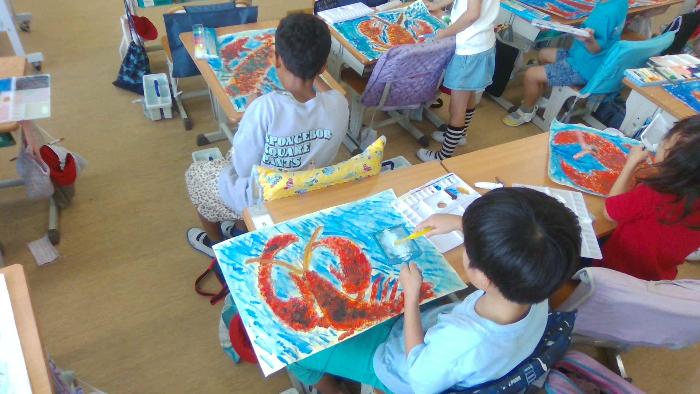 ザリガニをかこう Tweet 更新日:2025年10月03日 1学期に観察していたザリガニの絵を1年生が描いています。 ダイナミックな構図に、これまで学習した色の塗り方で、一人ひとりが伸び伸びと作品作りに取り組んでいます。 特徴を捉えた、素晴らしい作品がたくさん出来上がっています。