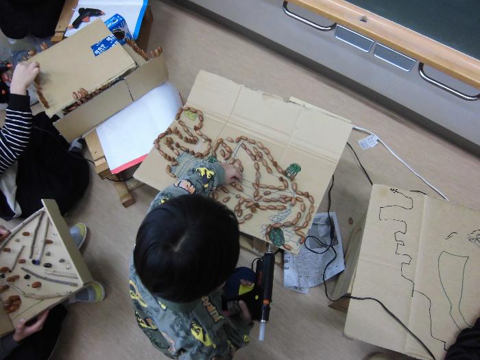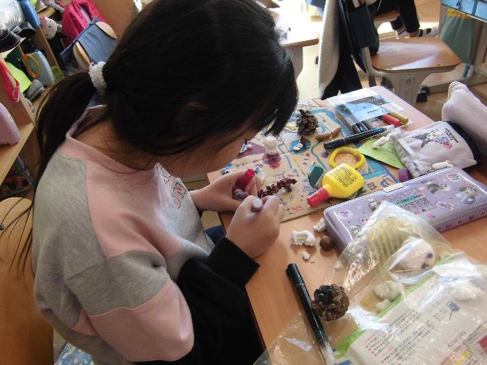 あきとなかよし Tweet 更新日:2025年11月20日 1年生が生活科で「あきとなかよし」という学習をしています。 集めた木の実(ドングリやマツボックリなど)を使い、自分の思うままに自由に工作していました。 木の実をくっつけるために、グルーガン(接着剤を熱で溶かして接着する道具)を上手に使っていました。 秋の木の実をたくさん使って、あきとなかよしになる姿がありました。