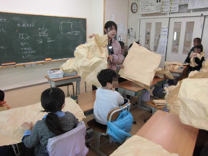 図工「ぎゅっとしたい わたしの『お友だち』」 Tweet 更新日:2026年01月16日 2年生の図工では、大きな紙を丸めたり折ったりして、自分だけの「お友だち」作りに挑戦しています。 ぎゅっと抱きしめたくなるような形を目指して、袋をひねったり、モールやリボンで飾り付けたり工夫して作っていきます。 これから個性が光る愛らしい「お友だち」がたくさん誕生しそうです。