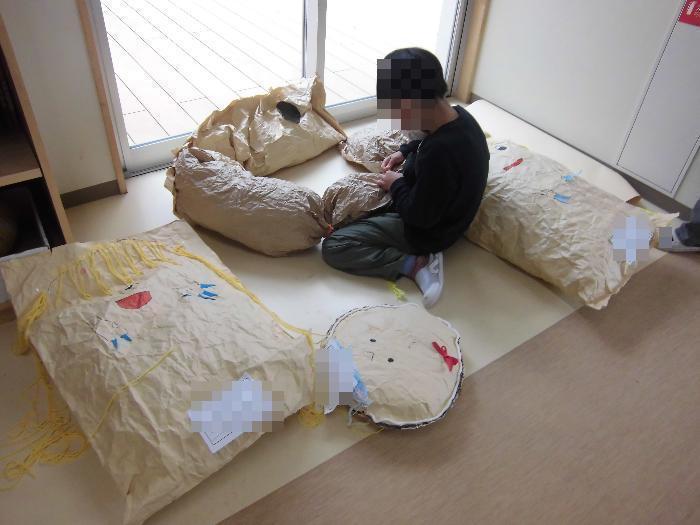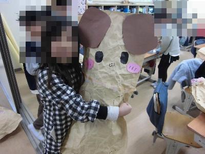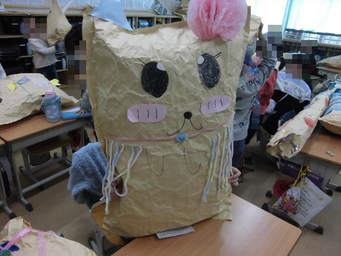 教室を覗くと、色とりどりのリボンでドレスアップした子や、袋の形を活かして長い耳を作った子など、アイデア溢れる作品がずらり。子どもたちは「ここはね、ふわふわにしたんだよ!」と、こだわりを嬉しそうに教えてくれました。