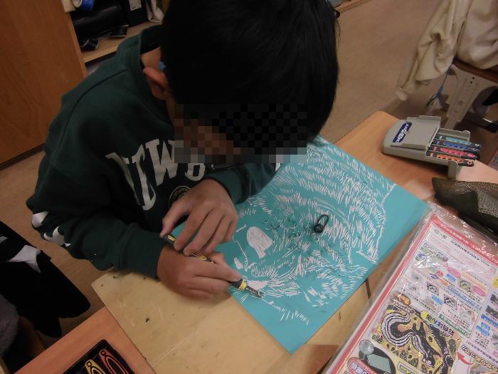 彫刻刀を扱うのに緊張した様子も見られましたが、刃先の向きや手の添え方に細心の注意を払い、安全第一で一彫り一彫り丁寧に進めています。板を削る心地よい音が教室に響き、集中力あふれる空間となっています。