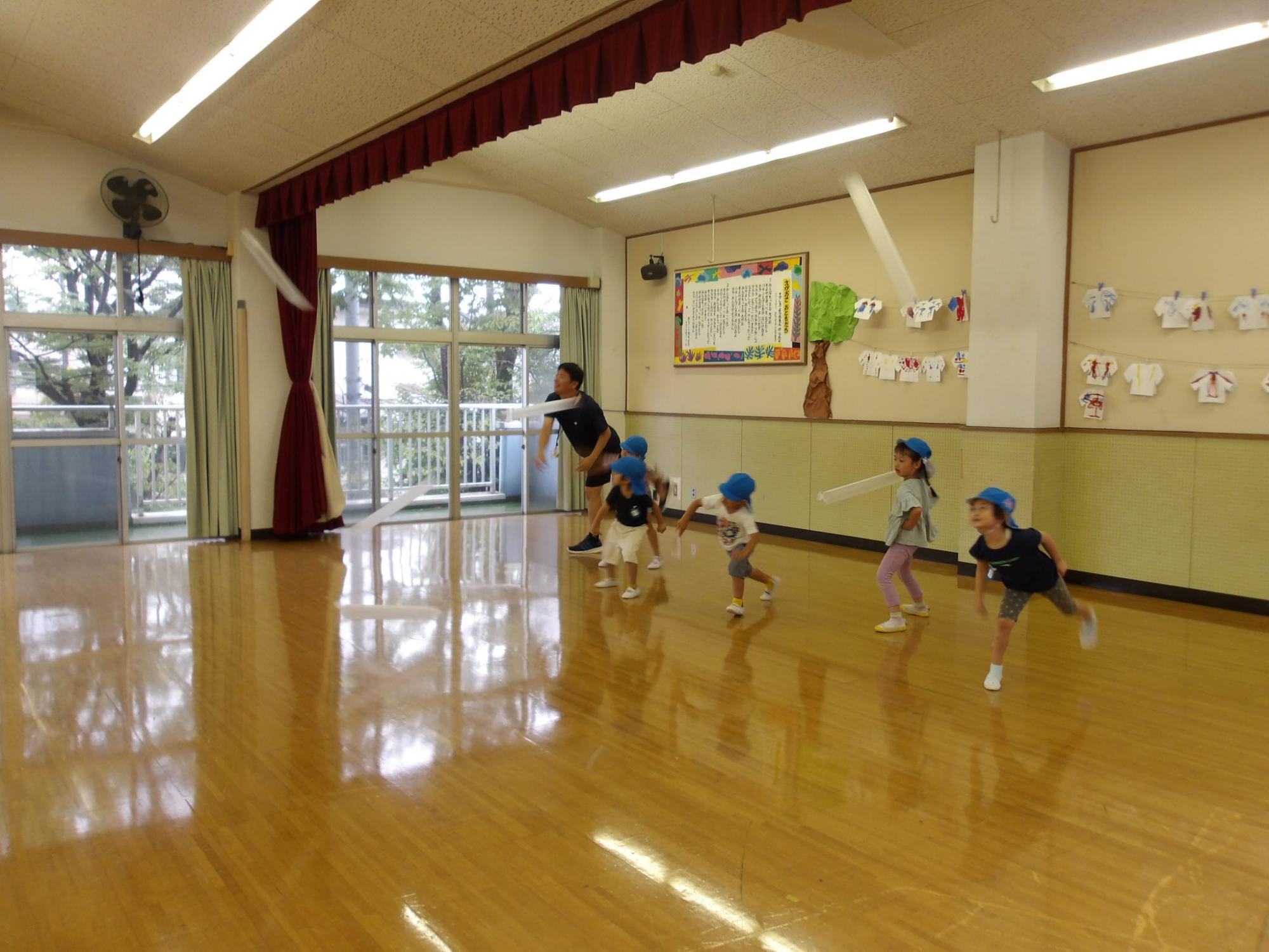 傘袋で作った飛行機を飛ばして遊びました。必要なのは腕の力か、水平に動かすコツか、それとも両方か…。