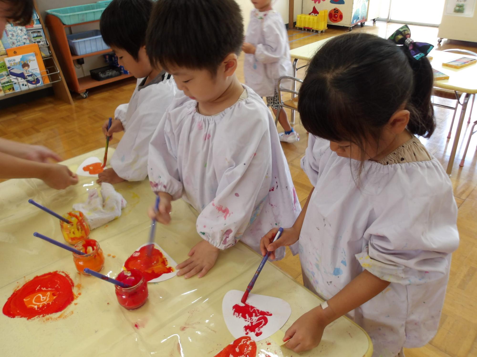 こいのぼりの体の色は何色がいいかな。と自分たちで色を決めて絵の具で染め紙を行いました。小さく畳んだ紙を広げると「できた!」「きれい!」と満足して喜ぶ姿が見られました。
