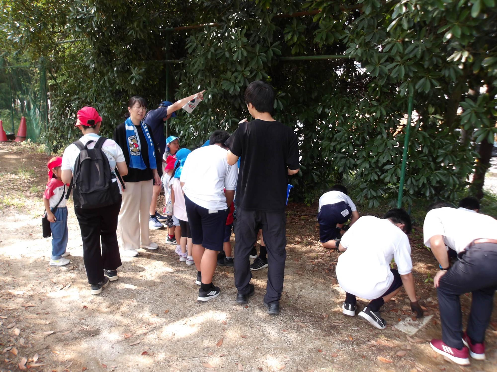 近隣の第六中学校に散歩に行きました。事前に生徒さんが木の実が落ちている場所を探しておいて案内してくれたり、拾ったものをプレゼントしてくれたりしながら一緒に集め、たくさんの木の実を集めることができました。