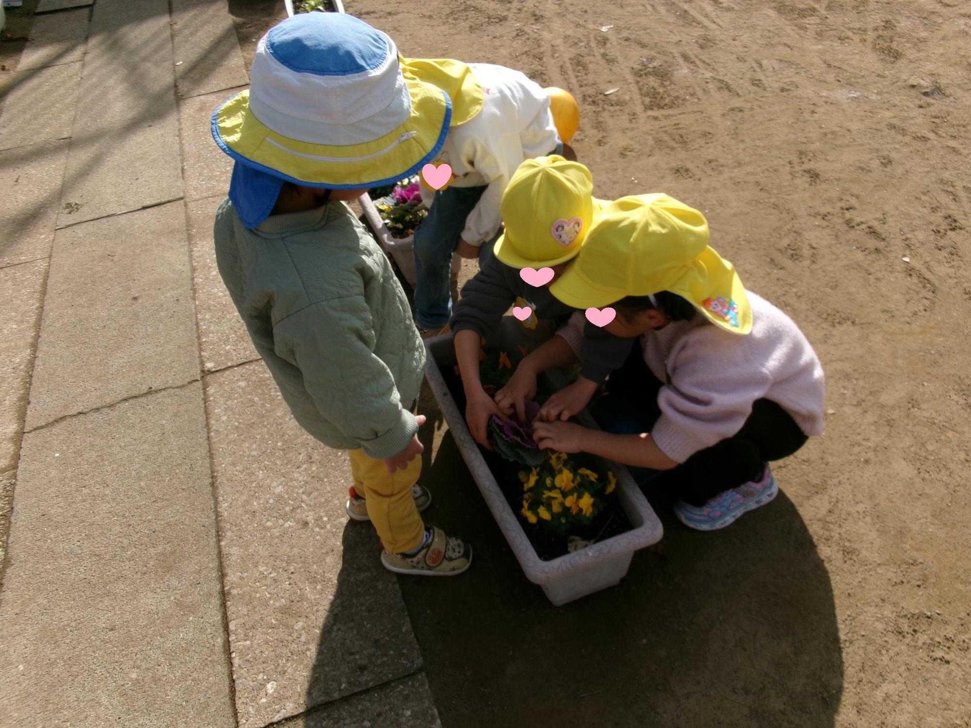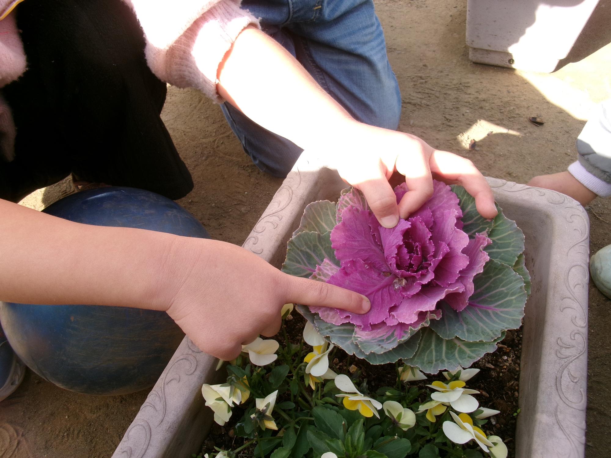 「これはなーに?」「葉ボタン?」プランターの花を植え替えると、すぐに気づく子どもたちです。