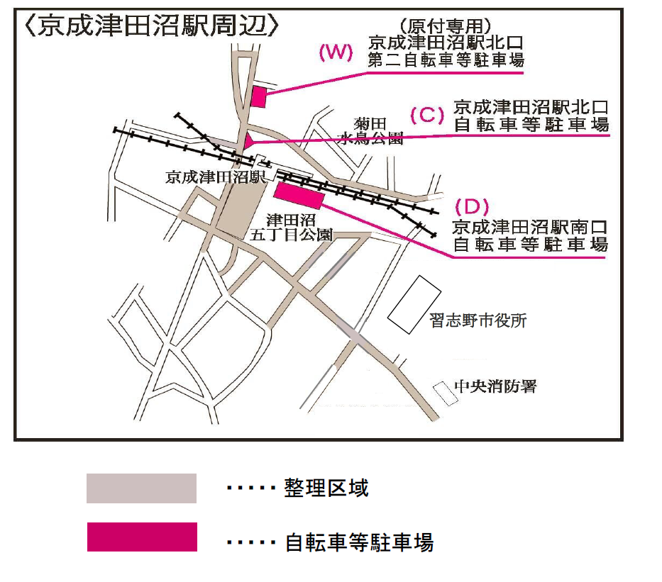 京成津田沼駅周辺の自転車等駐車場と整理区域 (PNG: 361.9KB)