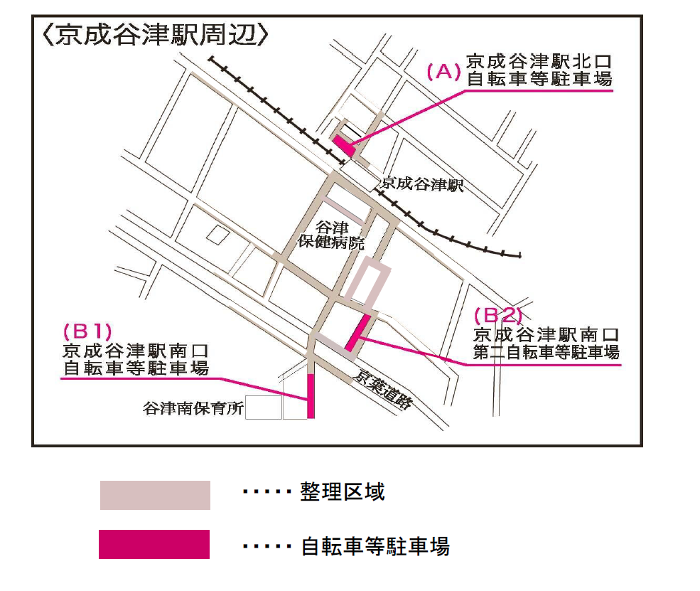 谷津駅周辺の自転車等駐車場と整理区域 (PNG: 379.0KB)