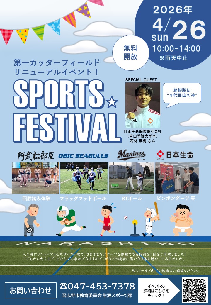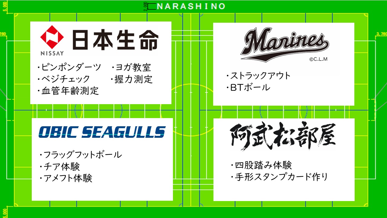 人工芝にリニューアルしたサッカー場で、阿武松部屋・オービックシーガルズ・千葉ロッテマリーンズ・日本生命保険相互会社とコラボしたスポーツ体験会などのイベントを開催します!こどもから大人まで、どなたでも参加できますので、ぜひこの機会に思いきり体を動かしてみませんか?