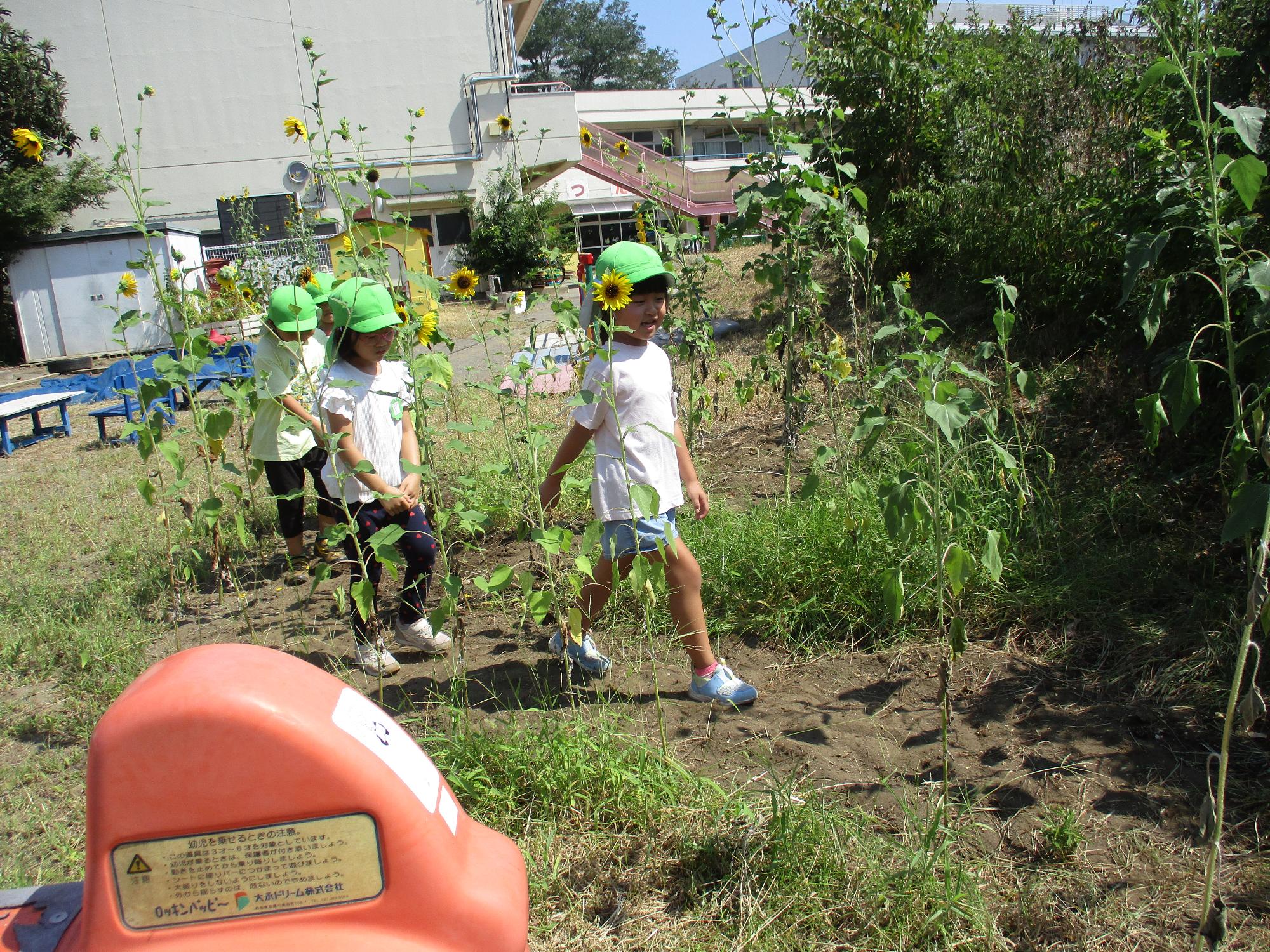 ヒマワリの迷路をみんなで歩いてみよう!自分の背丈よりもヒマワリが大きくて驚く様子も見られました。
