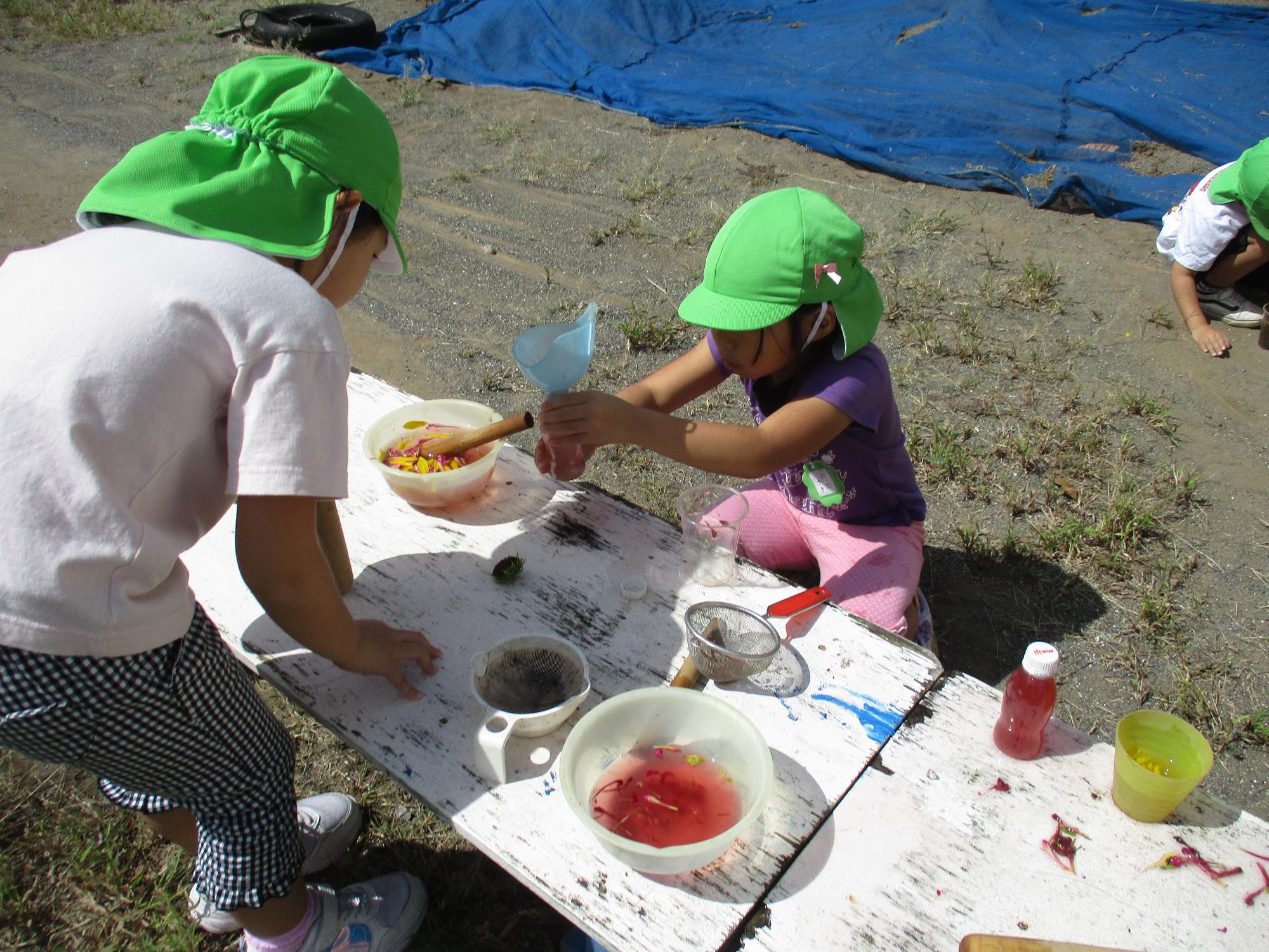 園庭に咲いたオシロイバナやヒマワリの花びらで色水遊びを楽しみました。