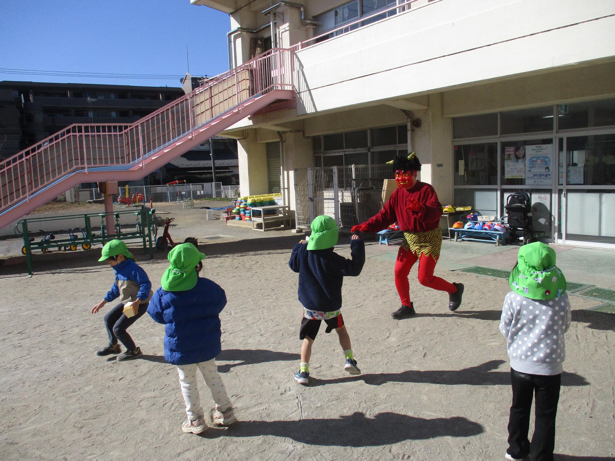 赤オニがきました。ちょっぴり怖くて豆をまくことを忘れる子、オニに立ち向かう勇気のある子と様々な姿が見られました。