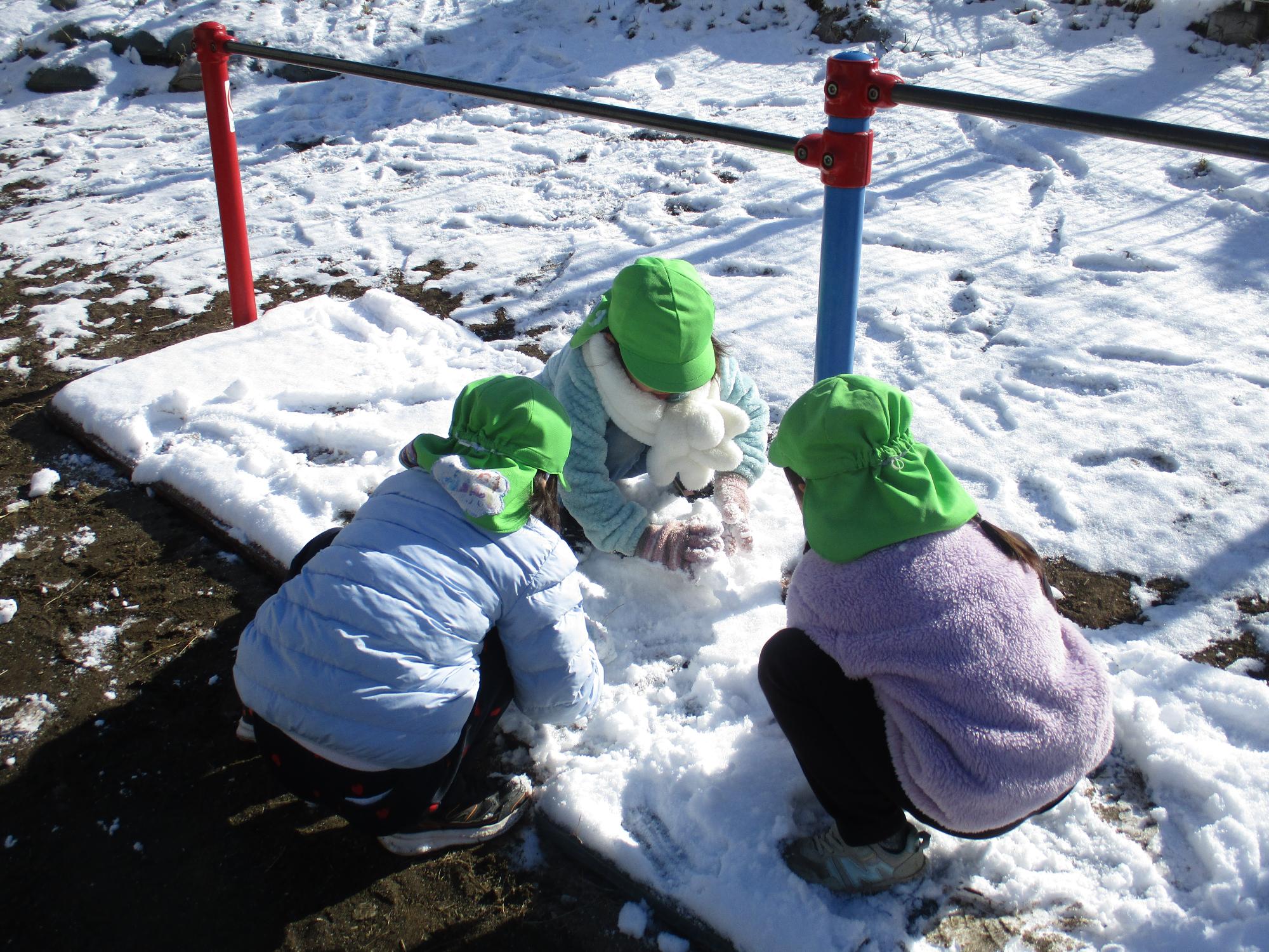園庭に積もった雪に大喜びのこどもたち。雪だるまを作ったり、雪投げをして雪の感触を味わいました。