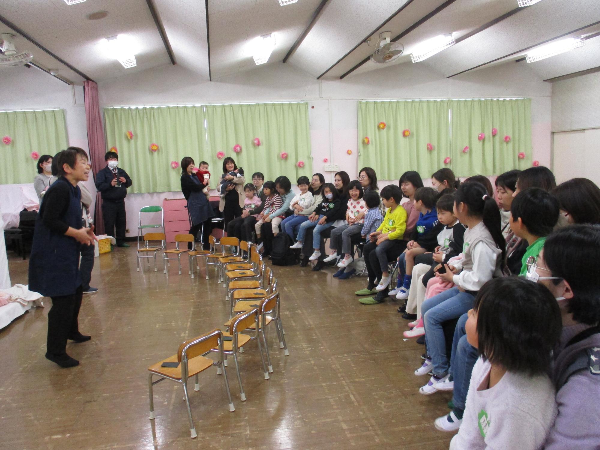 お楽しみ会で人形劇を見て、一緒に踊ったり歌を歌ったりしながら楽しみました。