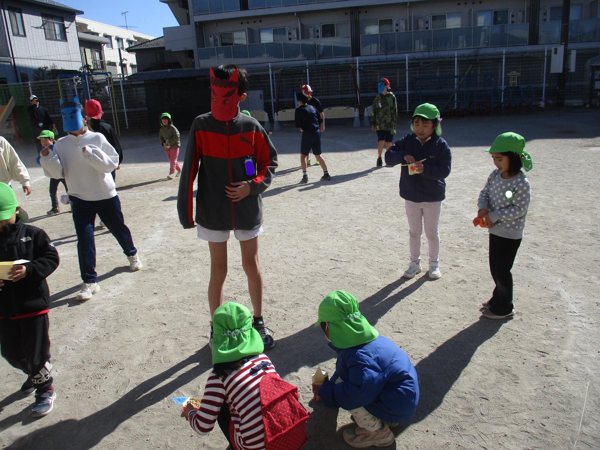 津田沼小学校5年生がオニのお面を被って鬼役をしてくれました。「おにはそと」と言いながら優しいオニに豆をまいていました。