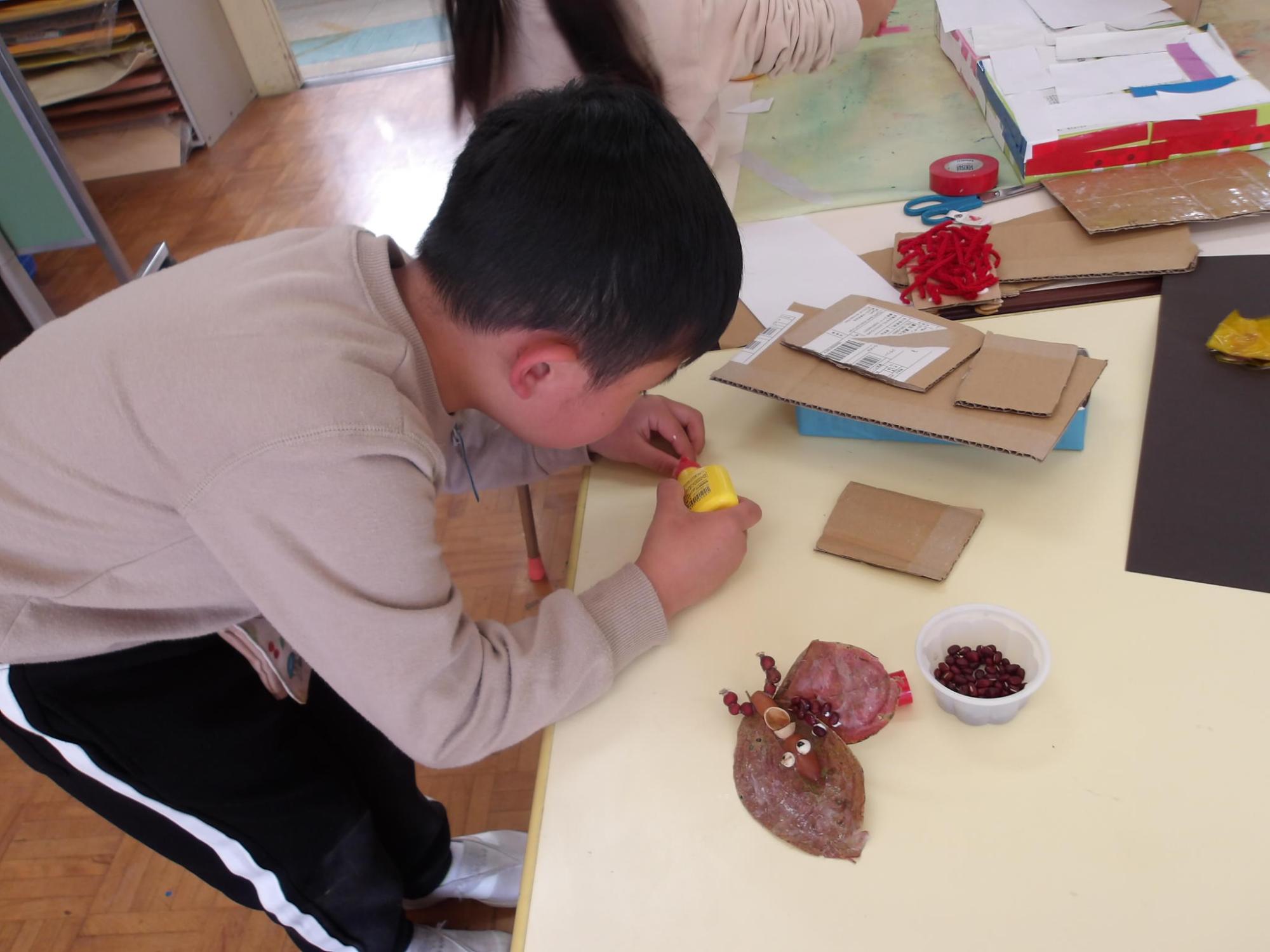 自分たちで拾ってきた木の実、園庭に落ちていた葉を使って木の実制作を楽しみました。「この葉っぱは、羽みたいだね。羽のついた恐竜を作ろう!」「2つ重ねると、くちばしみたいになるよ。かっこいい」など自分のイメージを形にして作り上げていました。