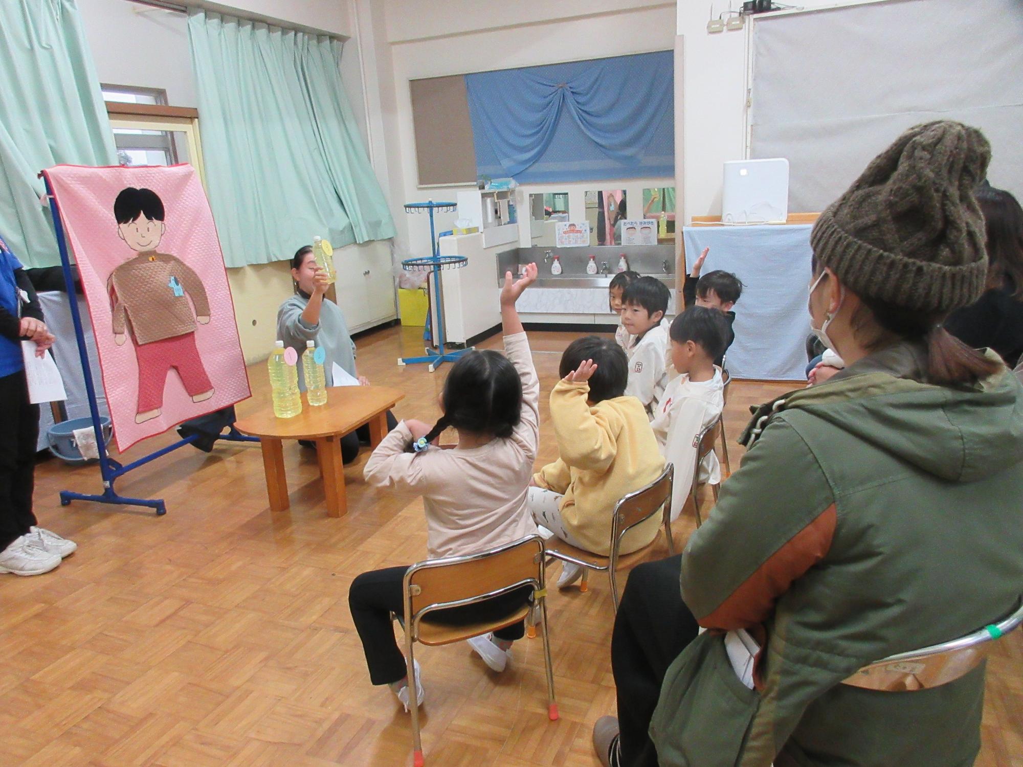 おしっこの仕組みについて、分かりやすく説明できる媒体を使用し、親子健康教育を行いました。